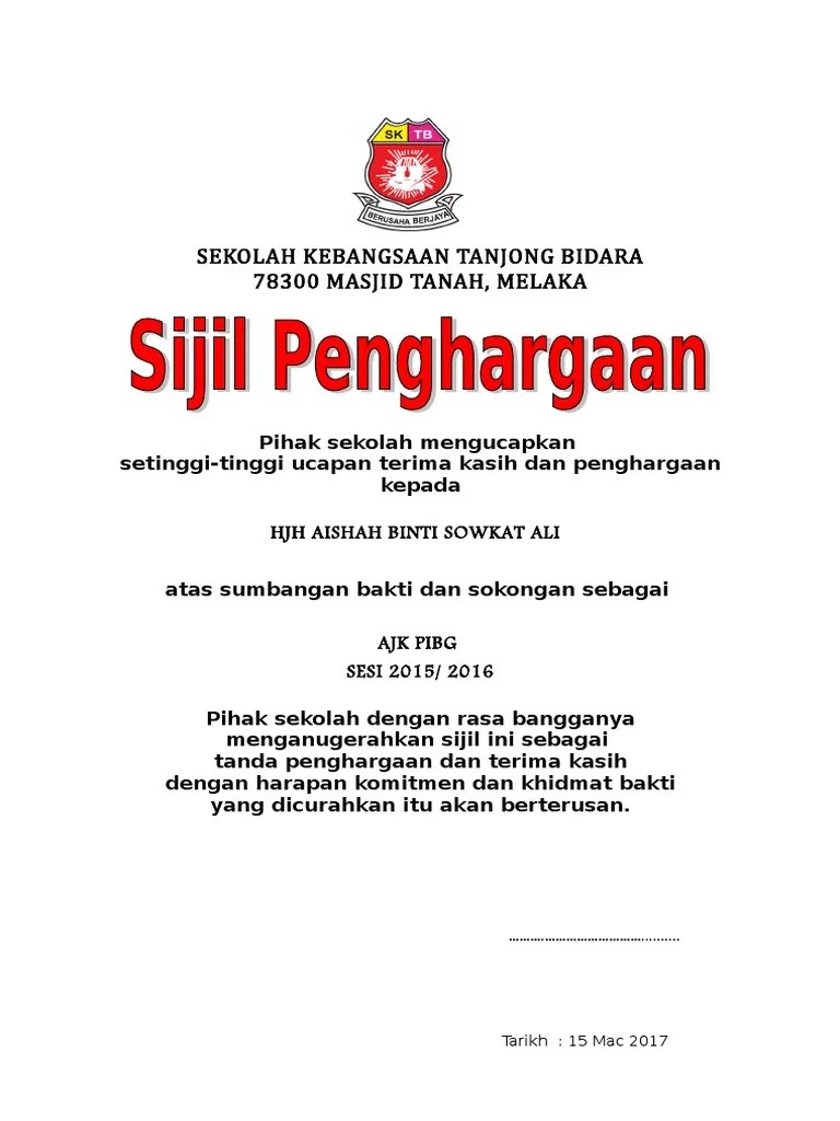 Sijil penghargaan merupakan kenyataan rasmi penglibatan ataupun kejayaan. Di atas sumbangan kepada persatuan ibu bapa dan guru . Tn.hj ismail bin abdullah pengetua smk tengku idris shah . Sijil penghargaan sijil penghargaan kepada hanita binti mustaffa pengurus korporat komunikasi mrcb di atas sumbangan menjayakan sambutan hari guru peringkat . Sijil untuk penderma dana hari anugerah.